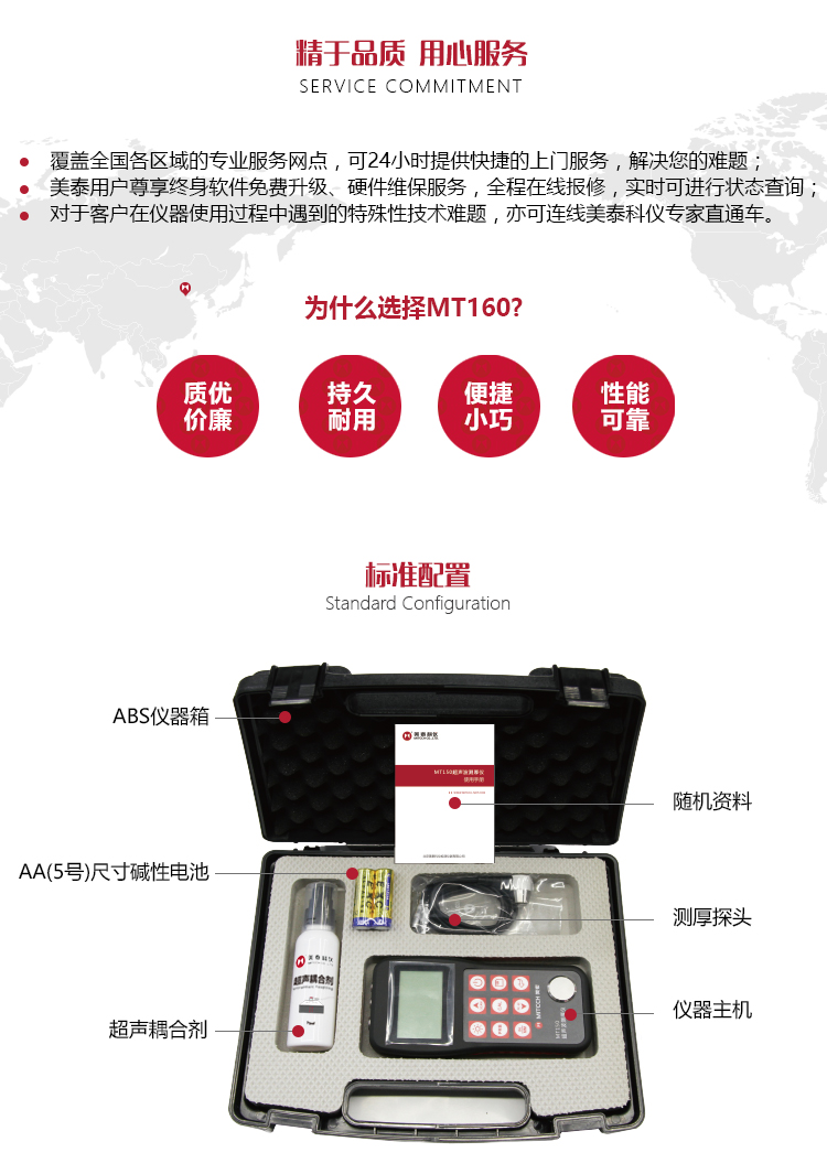 MT160超聲波測厚儀,基于超聲波測量原理,可對金屬、塑料、陶瓷、玻璃及其他多種超聲波的良導體材料進行厚度測量,也可實現(xiàn)對材料聲速的反測。與傳統(tǒng)的測量方法相比,超聲波測厚儀的優(yōu)勢在于它只要接觸到被測工件的一面即可完成測量,其獨特的無損檢測性能為封閉類管材、容器等厚度檢測受局限的工況提供解決方案,被廣泛應用于石油、化工、冶金、造船、航空、航天等領(lǐng)域的生產(chǎn)設(shè)備中各種管道及壓力容器腐蝕減薄程度的監(jiān)測,也可用于對各種板材及各種加工零件做準確的測量。