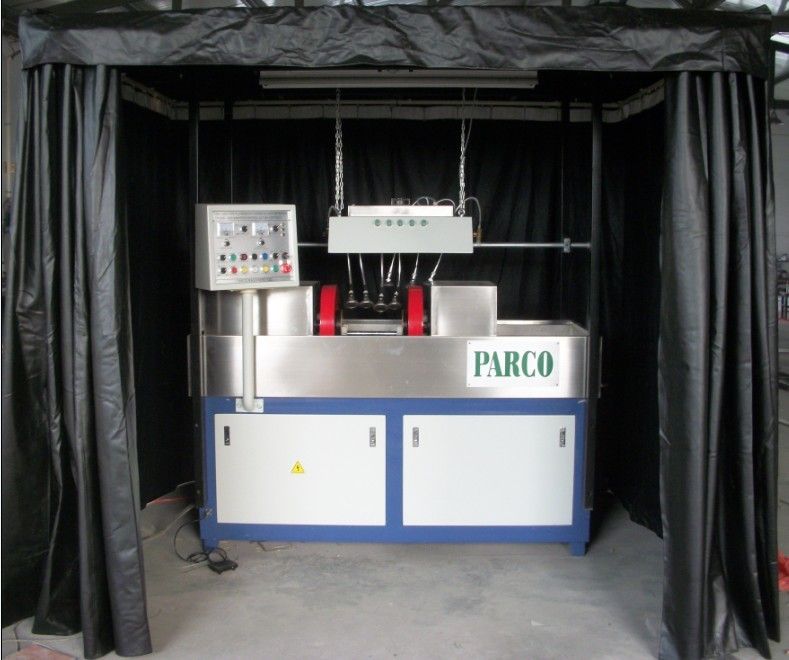 磁懸液噴灑及回收系統(tǒng)由積液斗、儲液箱、噴液泵、攪拌泵、管道、噴淋頭、濾網(wǎng)等部分組成,對工件進行噴淋、積液、濾清、回收以便循環(huán)使用。噴淋頭安裝在床身的前側(cè),自上而下對工件進行噴淋,每路噴淋頭均設(shè)有調(diào)節(jié)閥,保證工件充分濕潤而液體不飛濺。攪拌泵電機使磁懸液中的磁粉充分懸浮防止磁粉沉結(jié),同時亦用于床身右端的手動噴槍的噴淋,手動噴淋由軟管接出,便于手動操作。配備兩道過濾裝置,可防止污染,確保磁懸液的潔凈;承載磁懸液的容器和積液斗均為奧氏體不銹鋼材料,其容積約為40升。